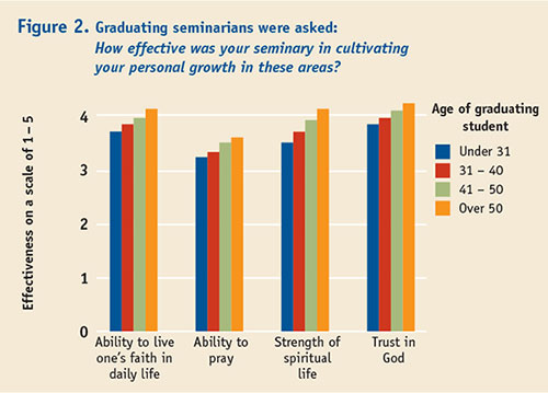 It is perhaps surprising to note, however, that students graduating with the standard ministry preparation degree, the master of divinity (M.Div.), rate these four areas of spiritual formation as somewhat less effective than do their colleagues graduating with professional M.A. or doctor of ministry (D.Min.) degrees. However, with the exception of ability to pray, M.Div. students still rate the other three areas as 4 (“effective”) on the 1–5 scale. This may be due to differences in the degree programs, but it may also be due to the makeup of students in each degree. D.Min. and professional master’s students tend to be older, and older students tend to rate their theological schools as more effective in spiritual formation.