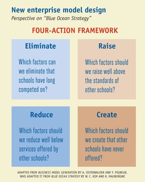 How to do this? The four-action framework on the facing page asks strategic questions that address both abandoning the past (left hand side in blue shades) and creating the future (right-hand side in brown shades). On the left side of the diagram are questions about what to eliminate or reduce, targeting Osterwalder and Pigneur’s “cost efficiencies and effectiveness” building blocks. The right side asks questions about what to raise or create, which are associated with Osterwalder and Pigneur’s “value” building blocks.