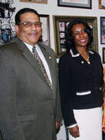 | Interdenominational Theological Center president Michael Battle with Sandra Yates (above) and Ann and James Gavin with Marianne Clarke (below) at a recent fundraising reception at the Gavin home. (ITC) |