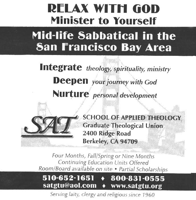 | Better: Headline: [Type reversed on black] Mid-life Crisis? Get serious. Relax. With God. Image: Body copy: School of Applied Theology |