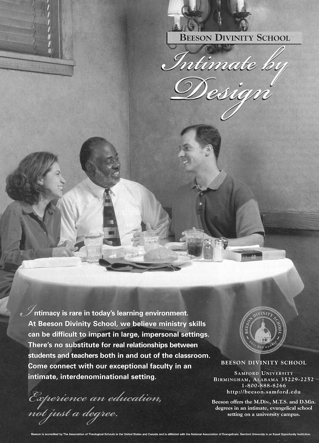 Good News: The seminary can afford a full-page color ad. I pause, perplexed that a restaurant ad is in Christianity Today. I read the headline “Intimate by Design” and realize, No, this isn’t about dining, this is about marital counseling. Or is it? I read the beginning of the body copy: “Intimacy is rare in today’s learning environment.” This is a typical classroom? I then notice “Beeson Divinity School” above the headline. The gold color of that copy box leads my eye to the gold type of the tagline: “Experience an education, not just a degree.”
