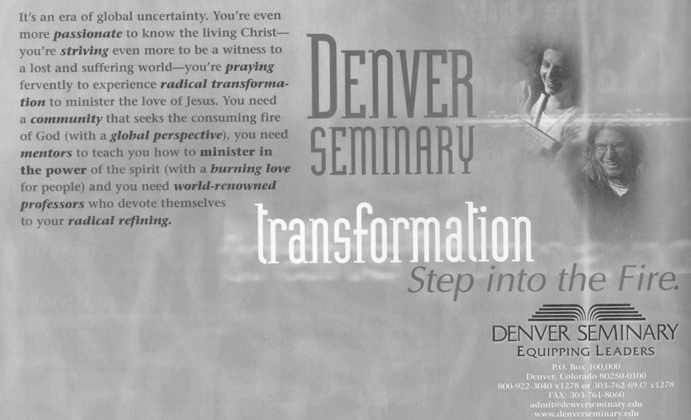 Good News: The dramatic orange color that can’t be shown on this page catches my eye. I first notice the words: “Denver Seminary.” Then I see small images of Gen-X prospects (male has grunge look). I trip over the big, multi-syllabic word “transformation.” I’m intrigued by the exhortation: “Step into the Fire.”