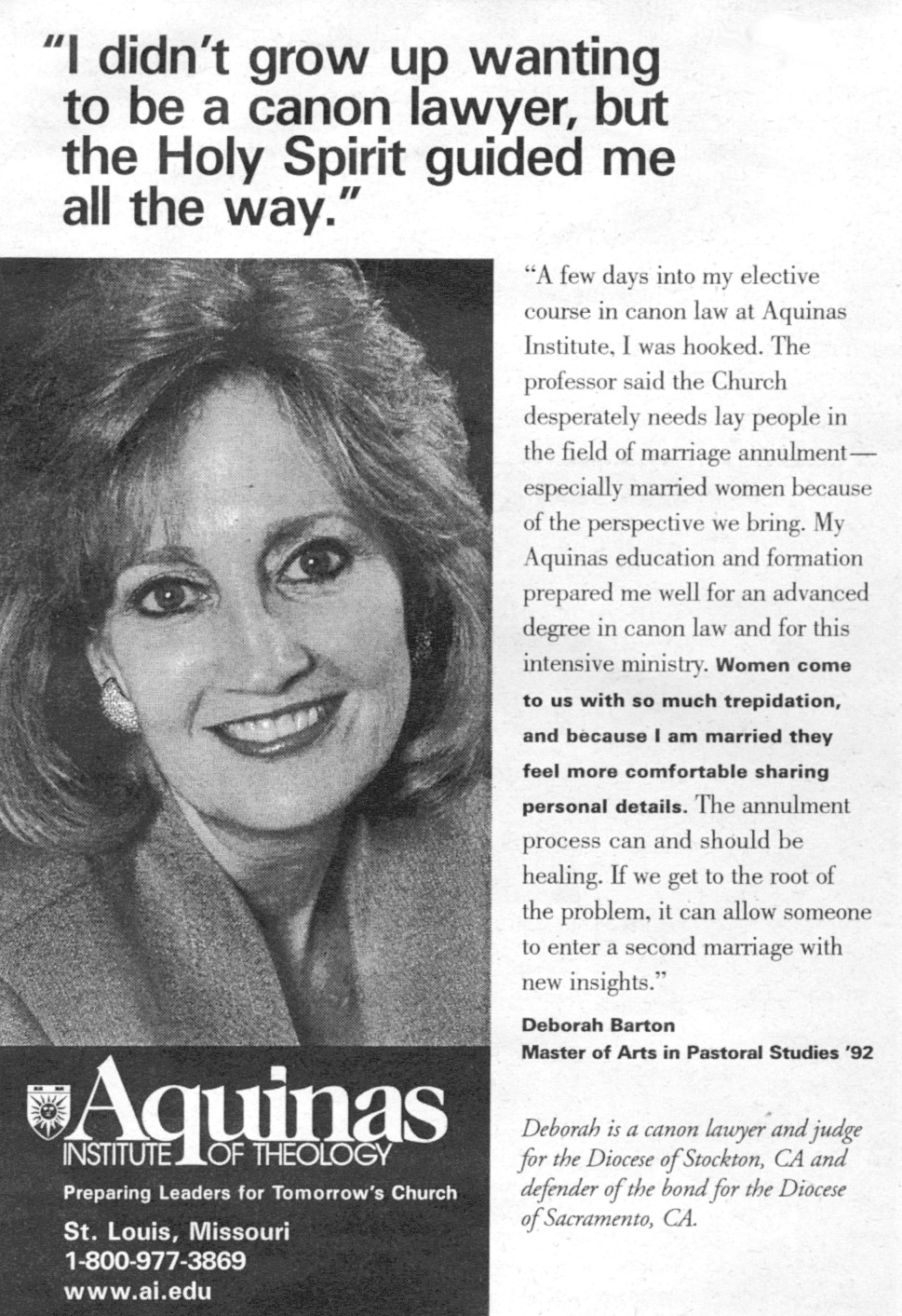 Better: Headline: Aquinas Institute of Theology: Our name says volumes. We’ll help your name say volumes, too. Image: Body copy: [Student name] Aquinas Institute of Theology 1-800-977-3869 Deborah is a canon lawyer for the Diocese of Stockton, CA, and defender of the bond for the Diocese of Sacramento, CA. |