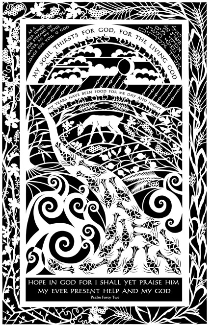 Thirst for God draws us into conflict. And of course, the conflict gets more intense, the closer we approach to God. When you think about it, this makes perfect sense — although it is still hard to accept. For does not Scripture over and over represent the place closest to God — be it Sinai, Jerusalem, the Sea of Galilee, the foot of the cross — as the epicenter of a storm? The psalmist says, “Your waves and your billows overwhelm me” — and Diane Palley shows us the waters of God, at the same time tumultuous and life-giving. If you drink from that stream, you will get buffeted; you can nearly drown. This is surely the hardest experience of the life of faith, and there is much evidence for it in the experience of faithful Jews and Christians over centuries and millennia. You know it is thirst for God that has brought you to this place of intense conflict, this place where the buffeting itself seems to come from God. “Your waves and your billows overwhelm me.” Nearly drowning in the torrent that flows from God — can we say that this is what Jesus experienced (and surely for Christians, Jesus is the definitive pray-er of this psalm) — isn’t that the experience of Jesus, when he shed tears in Gethsemane, when he thirsted on Calvary? I am buffeted, overwhelmed; I am brought very low — and still, “I thirst for you” (cf. Psalm 63:2), for the living God.