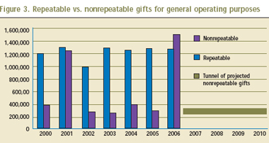 When it comes to the seminary’s giving program, it is been one surprise after another for Theological School C. Some years have seen hefty unexpected bequests, along with a couple of million-dollar-plus grants from a family foundation, while others have seen very little in the way of nonrepeatable support, and now the board is perplexed about setting annual fundraising goals for the school. An accountant has developed a variation of the “snake-in-the-tunnel” policy that the board uses in determining endowment spending as a way to even out budget projections for nonrepeatable gifts. (See the New Year 2005 issue of In Trust , page 17, for more information on this policy.)
