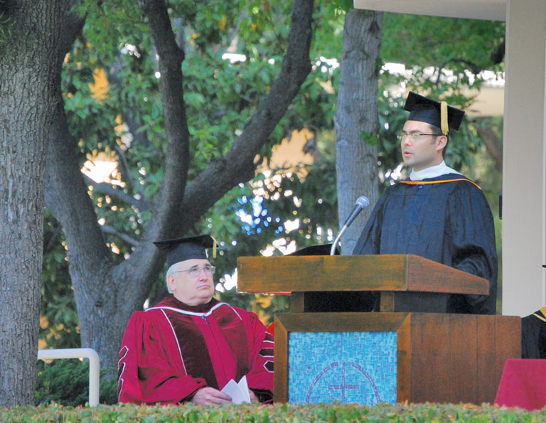 | Imam Jihad Turk, director of religious affairs at the Islamic Center of Southern California, offers a prayer at Claremont School of Theology’s 2009 commencement. At left sits President Jerry Campbell.