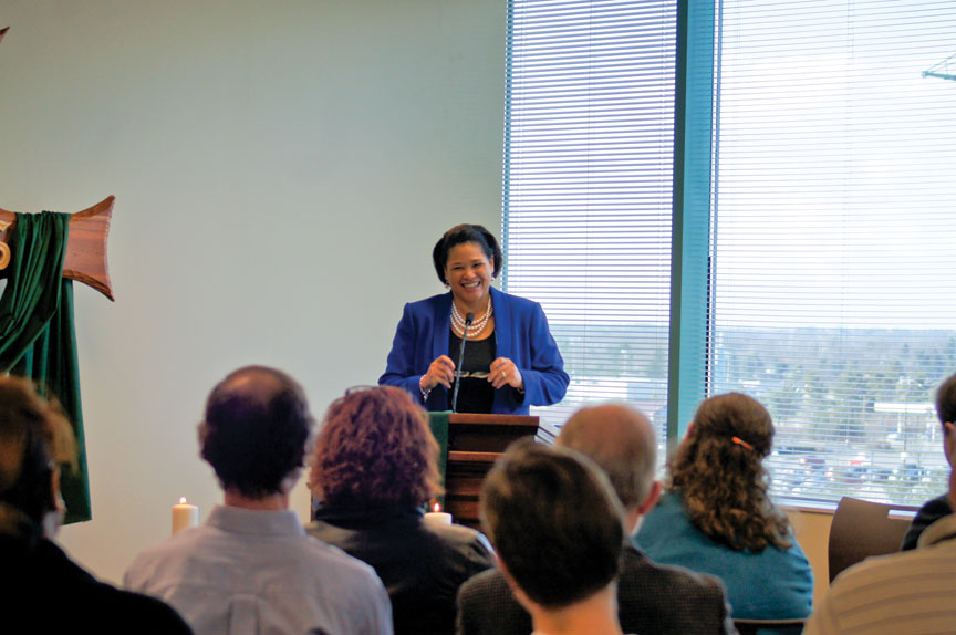 In 2013, the trustees of Lexington Theological Seminary decided to sell the school’s seven-acre property with its traditional buildings (opposite page, inset). Now in 16,000 square feet of rented space (opposite page), Lexington has the flexibility to serve both online and on-campus students. Top, President Charisse Gillett addresses the community in January 2014 at the first chapel service in the new building.