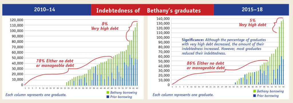 A: When we compare our 2010–14 grads against our 2015–18 grads, in terms of combined undergraduate and graduate debt, we see real progress. Current stats indicate that 56% of our students graduate with no debt and about 30 more graduate with debt that is manageable on a pastor’s salary. There is still a percentage of graduates with very high debt, but 86% have either no debt or manageable debt. Our goal is to push down the amount of money that students borrow and push up the number of students who borrow nothing. Compared to other schools, Bethany is on the low end of student indebtedness.