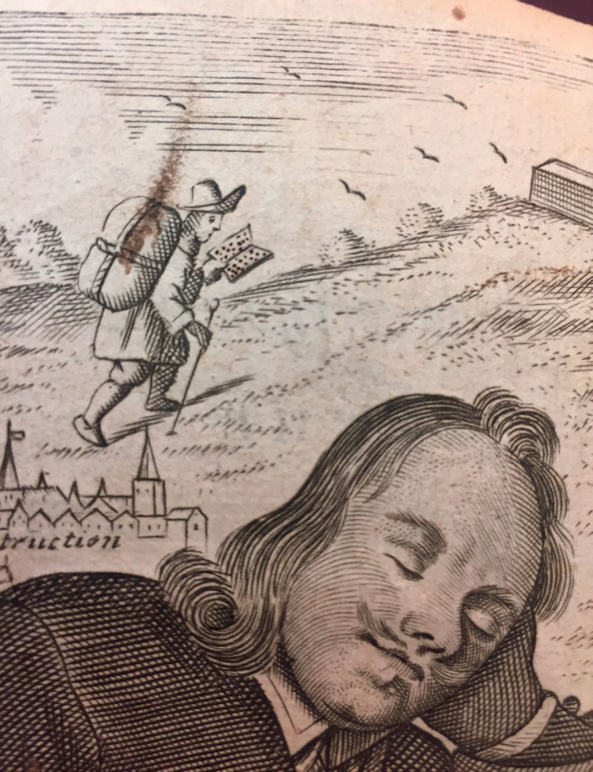 Part one is from the 12th edition of The Pilgrim’s Progress, published in 1689. It includes a charming drawing of Bunyan’s protagonist, Christian, on his pilgrimage, belongings in a bundle on his back, walking up a hill, reading a book. Part two is from the 1690 edition of The Pilgrim’s Progress and includes a flower pressed between two pages. Part three is from an entirely different book, a sequel to The Pilgrim’s Progress called The Third Part, published in 1693. At the time, it was believed to have been written by Bunyan himself, but we now know it was not, and the author is still unknown. The preface to part three is signed by “J.B.,” but this could not have been Bunyan, who died five years before it was published.