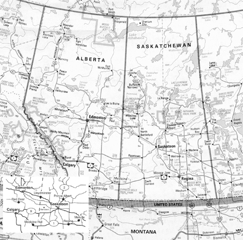 | St. Stephen’s internet courses are one way to overcome Canada’s vast distances. The maps show the Fletchers’ locations in Kerrobert and Regina relative to the school in Edmonton.