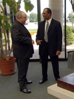 A unifying symbol at the seminary is a bronze sculpture (right) by Max Greiner Jr. of Jesus washing Peter’s feet. Located in the seminary’s Great Hall, it is a visual representation of a deep commitment to servant leadership that is part of the board’s self-understanding. Board members (like the Rev. Alton Garrison, pictured to the left with Dr. Winston Larry) frequently make reference to the sculpture during deliberations, and it is the most often photographed symbol for seminary guests. | |