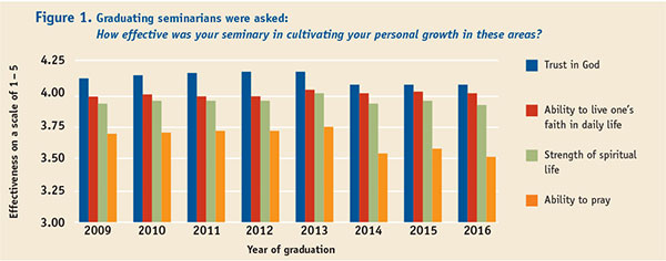 The questionnaire asks graduating students to rate the effectiveness of their school in facilitating 15 areas of personal growth, from “concern about social justice” to “enthusiasm for learning” to “self-discipline and focus.” Figure 1 shows the numerical values assigned to the four items related to spiritual formation, on a scale of 1 to 5. Trust in God is ranked highest (in the 6th position) relative to all 15 areas of effectiveness, followed by ability to live one’s faith in daily life (9th), strength of spiritual life (13th), and ability to pray (15th). The ability to pray has been last on the list of 15 for at least the last eight years.