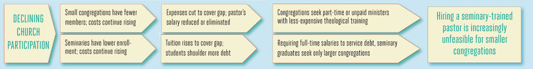At the same time, as many congregations struggle to keep the doors open in an era of declining membership, some are finding that they cannot afford a full-time pastor. And M.Div. graduates, many with heavy debt burdens that they have taken on to pay for their education, increasingly cannot afford the salaries offered by small congregations. Individuals, churches, and schools seem to be trapped.