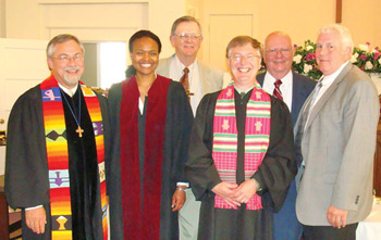 | The Rev. Archie Fugate (third from right), newly ordained and installed as minister of the First Presbyterian Church of Central City, Kentucky. Surrounding him are Presbyterian clergy of the Western Kentucky and Transylvania presbyteries, along with Professor Debra J. Mumford of Louisville Presbyterian Theological Seminary (second from left). |