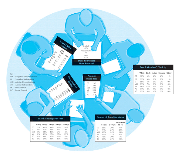 Schools also show significant differences in the length of time individual board members serve, with evangelical independent schools reporting that 29 percent of their members have served ten years or more, compared to peace churches with only 7 percent of their members having such extended tenure. In part, this sharp difference arises from term-limit policies that many boards have imposed upon themselves. Term limits or not, however, even the evangelical independents report a healthy admixture of new blood on their boards, with 44 percent of their members in office for five years or less.