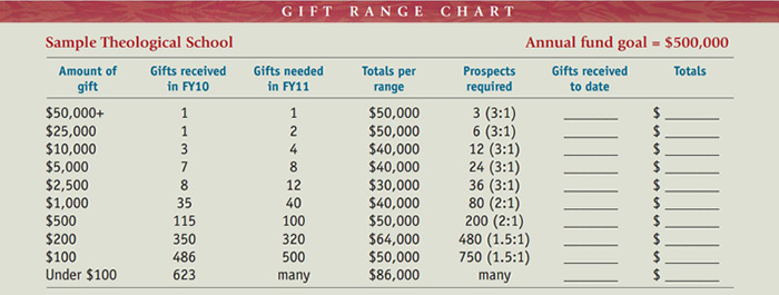 A gift range chart is a visual display of what success in the annual fund looks like. It alerts board and staff to gaps in the existing donor base. It also serves as an early alert system if progress toward the goal starts to lag. As the sample table illustrates, the categories of information that are most helpful to board members include: