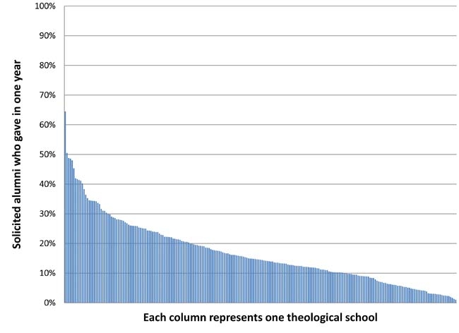 Every year, North American seminaries submit giving data to the Association of Theological Schools. According to the submitted data, Lutheran Theological Seminary in Saskatoon, Saskatchewan, enjoys the highest alumni giving rate — in the most recently reported year, 64 percent of former students who were solicited ended up contributing.
