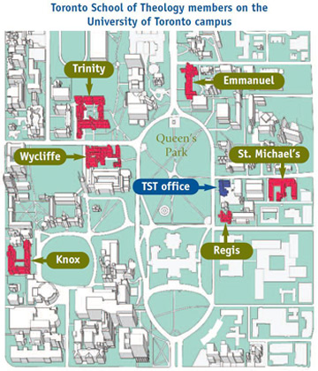 Trinity College (another Anglican theological school) is a stone’s throw away from Wycliffe, and four other schools are within a few blocks: Regis College (a Catholic faculty of theology run by the Jesuits), Emmanuel College (affiliated with the United Church of Canada), Knox College (part of the Presbyterian Church in Canada), and University of St. Michael’s College (another Catholic school, this one run by the Basilian Fathers). All are deeply connected to each other through their membership in the unique consortium that is the Toronto School of Theology, universally known as “TST.”