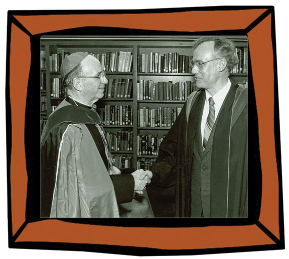 | Cardinal Joseph Bernadin (left), archbishop of Chicago from 1982 until his death in 1996, greets Father Donald Senior.