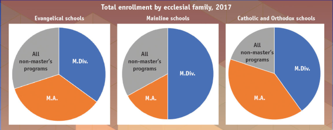 However, in 1998, M.Div. students represented 40 percent of all students enrolled in evangelical schools, but this figure was down to 35 percent in 2017. In the same years, the percentage of M.A. students rose from 25 percent of all students enrolled in evangelical schools to 35 percent of all students enrolled in evangelical schools.