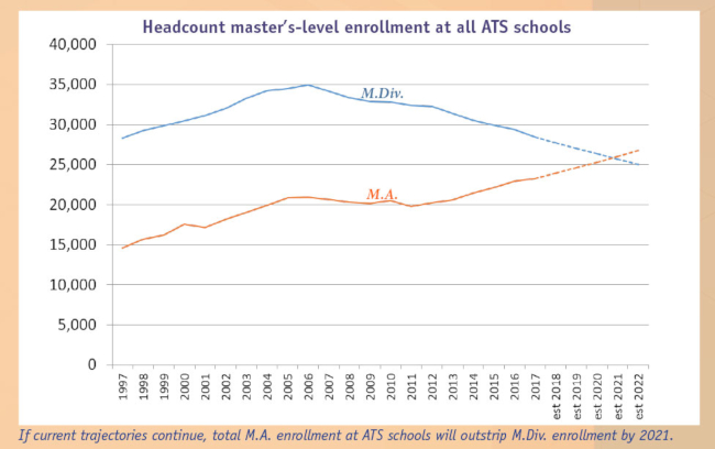 Over the last two decades, an enrollment trend has been changing the landscape of North American theological education. At institutions accredited by the Association of Theological Schools (ATS), the number of students enrolled in professional and academic master’s degree (M.A.) programs has been increasing while the number of students enrolled in master of divinity (M.Div.) programs has been decreasing.