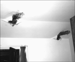 | Pacific Lutheran after the mudslide: above, students cleaning up; below, ceiling hole made by a tree. |