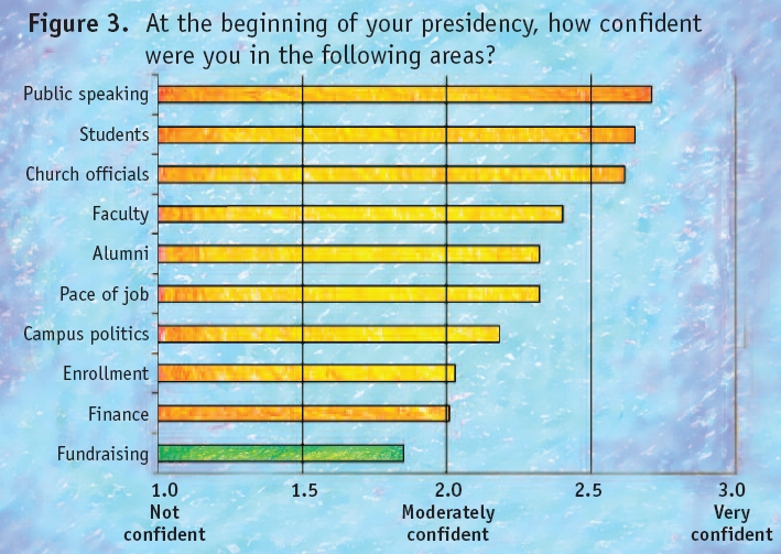 Why are boards not more deeply engaged? Some say that they hang back out of concern that the board might overstep its bounds and insert itself into management issues. We saw instances of this happening. In one school we observed, the dean said that the board “thinks it has a ‘policing mandate,’” and another administrator complained that board meetings were occasions to “beat up on staff.” More often, however, boards neglected their duties. They seemed especially hesitant to hold a president to fundraising benchmarks, particularly when they also feel unprepared for this task. (Figures 2 and 3 show that both new presidents and boards lack confidence in their fundraising abilities.) Many boards appear to restrict their roles to cheerleading and rubber-stamping.