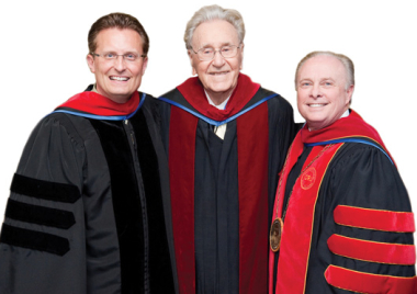September 25, 2009, the day of Mark Rutland’s inauguration as ORU’s third president, gave the university’s founder a setting to offer his public support to the new leadership. From left, Mart Green, Oral Roberts, and Rutland. Roberts died less than three months later. |