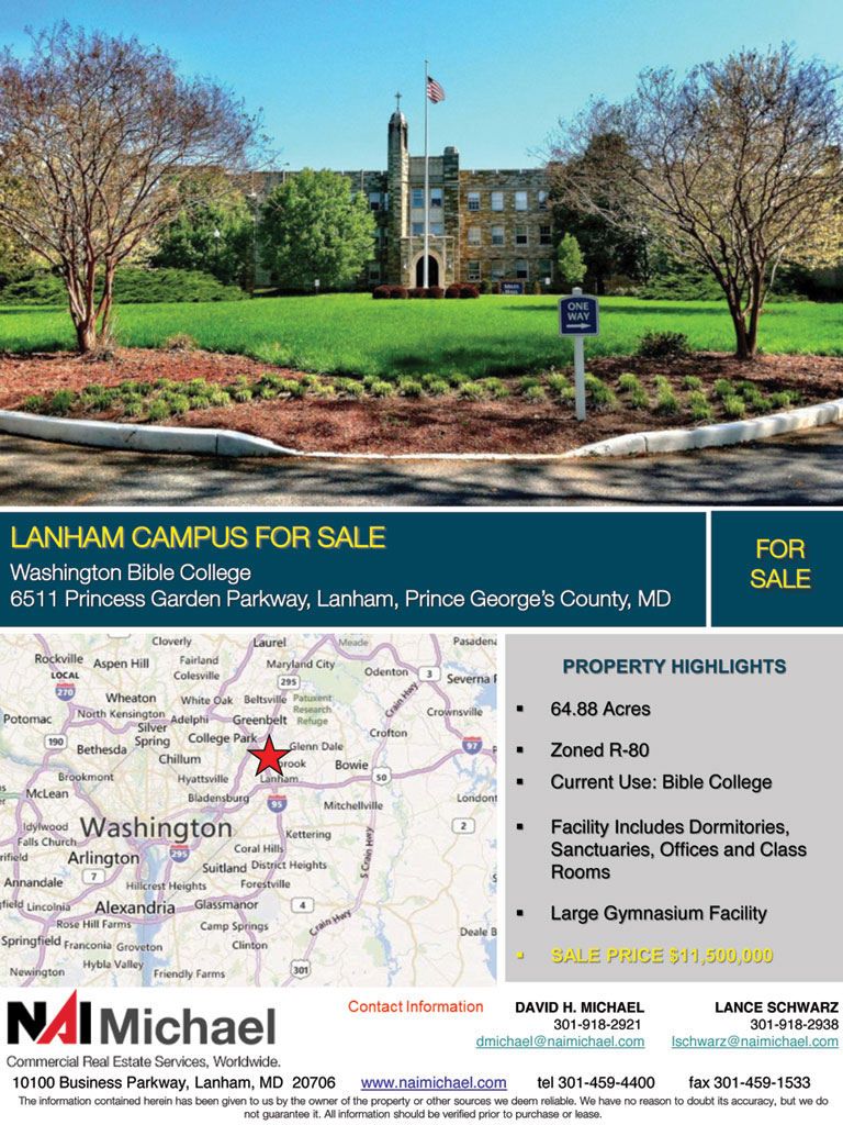 The Lanham, Maryland, campus of Washington Bible College and Capital Bible Seminary is being sold, and classes have moved to the Patriot Business Park in Greenbelt, Maryland, where the school is leasing an 18,575-square-foot facility with 11 classrooms, study areas, offices, and a library. The undergraduate division of the Maryland school, focusing on adult learning, is becoming the “LBC iLead Center, Capital Region,” while the graduate division is now called “Lancaster Bible College/Capital Bible Seminary, Capital Campus.”