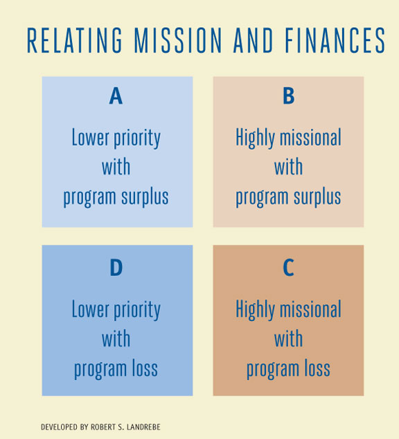 Let’s take a deeper look at one of the six questions listed above: “Which programs are underperforming and need to be phased out?” One way to approach this is to use the “Relating Mission and Finances” framework that I’ve adapted from business leaders (facing page).
