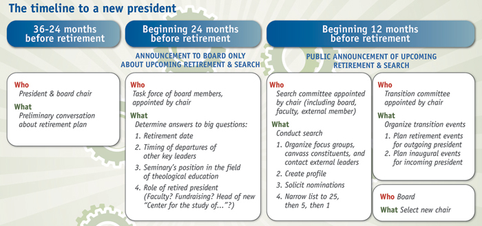 A couple of years before the likely retirement, with board input and approval, I put together a small task force of board members and asked them to tackle four questions. Their work would be confidential and would help us establish a timeline and a process. Their assignment was to learn: