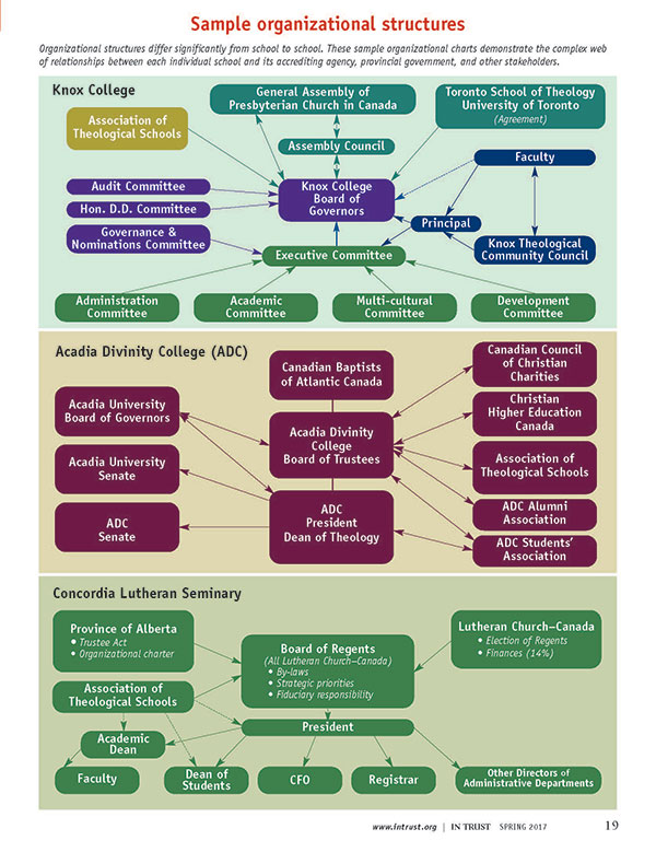 A common governance element in Canadian theological education is “Policy Governance,” a leadership paradigm known widely as the “Carver model.” This governance model directs a board of trustees to focus on the largest issues of institutional concern, discourages a board from straying from its appropriate purview (organizational “ends” or purposes) to inappropriate concerns (the “means” of arriving at those ends), and states that the board has a single employee — the president (who in Canada is often called a principal). In institutions that use the Carver model, communication from the board of trustees always flows solely to the president or principal, and through that person to the rest of the institution. Sometimes this clarifies matters, and sometimes it complicates them!