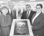 Helen and Wilfred Sopchyshyn, left, donated $3 million to Newman Theological College to build a new library and student residence. They are pictured here with their son and daughter-in-law Clint and Geneva Sopchyshyn and the plaque commemorating their gift, which is displayed in the Sopchyshyn Family Library.