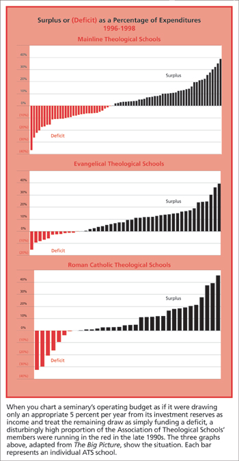 Is the theological school you serve one of the fifty-one Association of Theological Schools seminaries charted on the right whose operating budgets are in persistent deficit? Each red bar dropping below the zero line represents a school in the red.