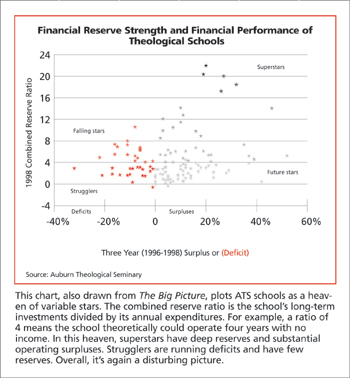 The past decade’s surging stock market made it easier for financially shaky schools and other nonprofit institutions to ignore or minimize to themselves and others the riskiness of their situations. A steady increase in the value of almost all institutional portfolios provided cash to more than make up for shortfalls elsewhere. That reliable stream of new money abruptly dried up last year with the bursting of the internet dot-com bubble and a general weakening of the economy. Many nonprofit organizations face the possibilities of grim days ahead. Some, perhaps many, theological schools are among them.
