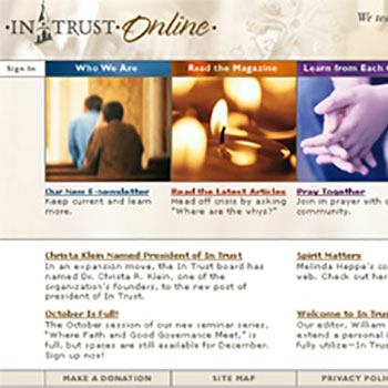 This unfamiliar looking version of In Trust magazine that you hold in your hand is not a permanent redesign of our magazine. Full-bore involvement of our small staff in the launch of In Trust Online, our expanded, interactive web site, made it impossible for us to produce simultaneously a full Summer 2003 issue.