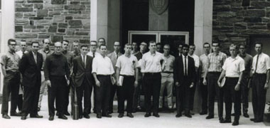 | In a photo taken in front of the seminary library with fellow members of the class of 1968, Logan stands at front and center, in a white open-collar shirt, with books tucked under his left arm. |