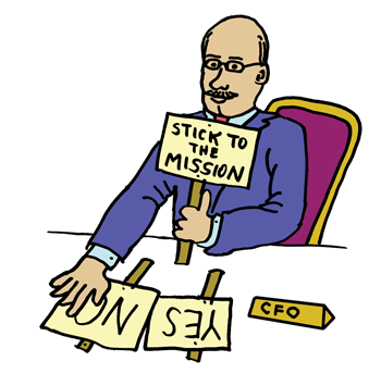 - Screening committees should rule out “yes men” who are likely to rubber stamp every idea a board brings to the table. Likewise, they should remove from consideration candidates who are little more than number-crunching versions of Dr. No. Even during lean times, “a CFO shouldn’t risk stifling everyone’s creativity by constantly saying ‘no,’” says Henderson.