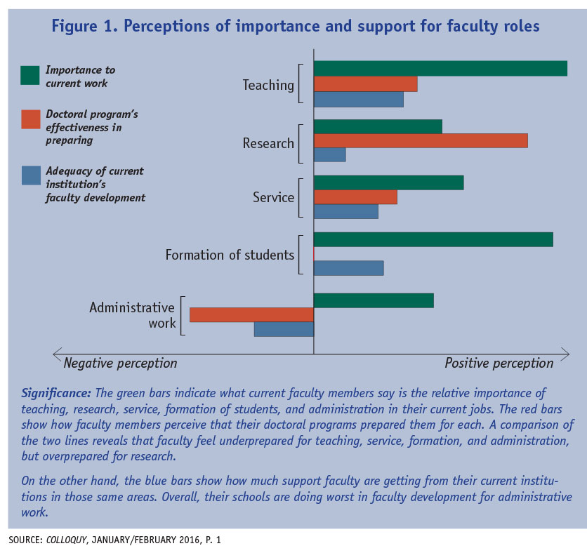 Figure 1 shows that faculty members perceive that student formation is second in importance only to teaching, and yet faculty members indicate modest preparation from their graduate programs and only slightly better preparation obtained through faculty development initiatives at their current institutions.