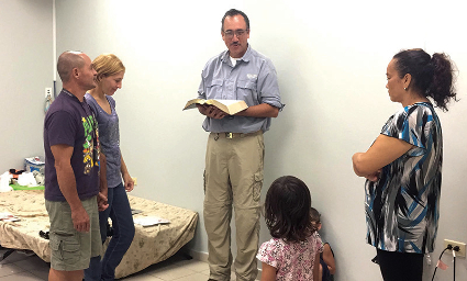 Efraín Velázquez, president of the Inter-American Adventist Theological Seminary, performed a wedding in a refugee center in the days following Hurricane Maria. Courtesy Inter-American Adventist Theological Seminary |