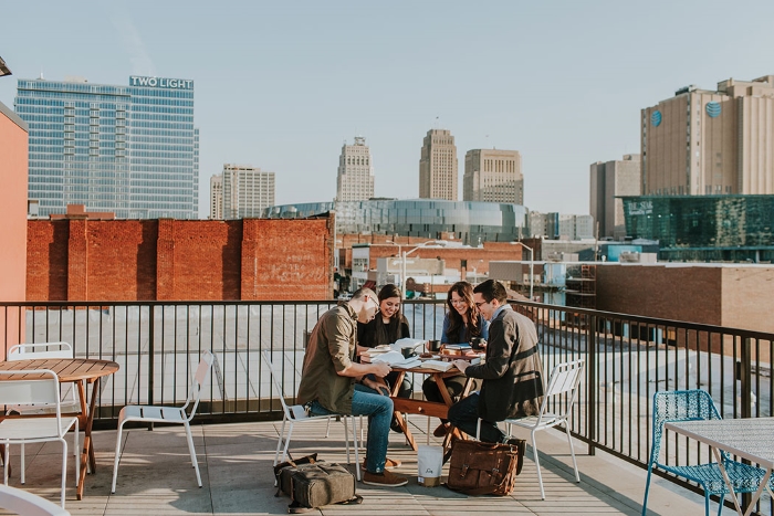 At Midwestern Baptist Theological Seminary, Kristin Lanier, Cole Knowlton, Ronnie Kurtz, and Mariela Martinez hit the books while looking over the Kansas City skyline. |