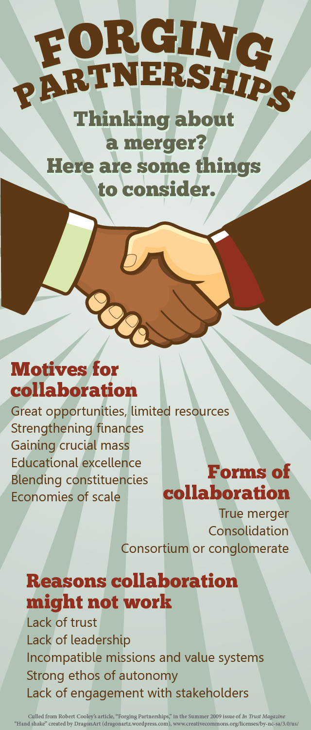 As a recession was wreaking havoc on educational institutions, the summer 2009 issue of In Trust included an article on things that theological school leaders should discuss and consider when pursuing a merger or partnership with another school. Written by Robert Cooley, the article is just as applicable today as it was then. The infographic above highlights some of the key takeaways from the piece, but you should read the complete article here. And to download a high-resolution version of this infographic, please click here.